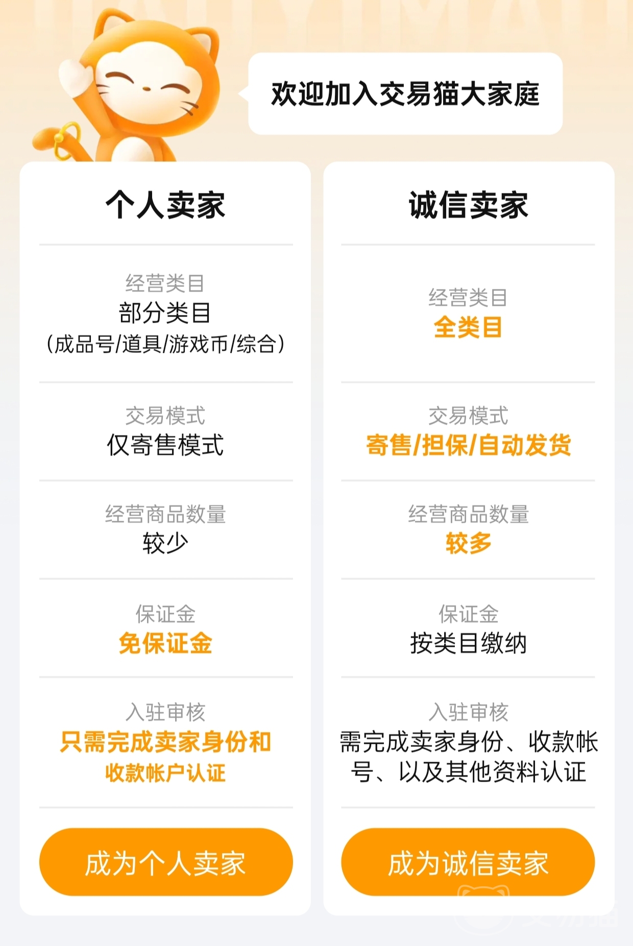 在交易貓出售賬號是非常簡單的,對于首次出售的用戶可以選擇成為個人賣家或者是誠信賣家,前者支持寄售模式,僅僅需要驗證收款賬戶和賣家身份即可。而后者的話則可以享受更多元化的服務(wù)。