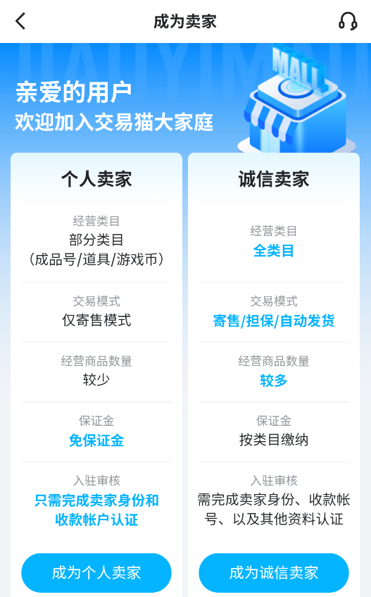 交易貓的特點在于它很方便且安全系數(shù)較高,說它方便是因為我們在進入交易貓平臺后,直接點擊最下方的“我的”,然后點擊“成為賣家”,根據(jù)提示提交相關信息并進行驗證,等驗證成功后就可以開始售賣我們的賬號了,這樣就給給我們省去了很多麻煩的步驟。