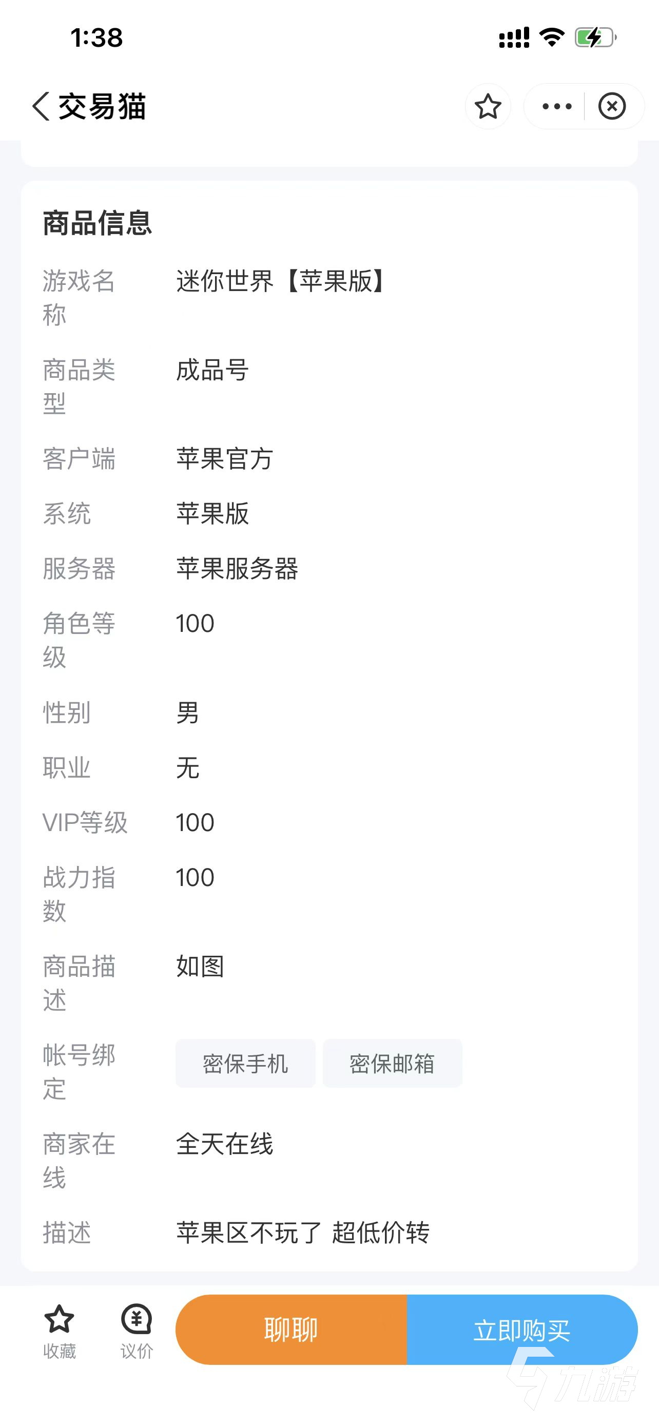 在迷你世界中,每個(gè)賬號都有詳細(xì)介紹比如等級、性別、職業(yè)、戰(zhàn)力等信息,便于玩家更快速了解改賬號信息。尤其是對于一些想從安卓專區(qū)換到蘋果專區(qū)的或者蘋果專區(qū)換到安卓專區(qū)的玩家而言,買個(gè)賬號或許是最佳選擇。