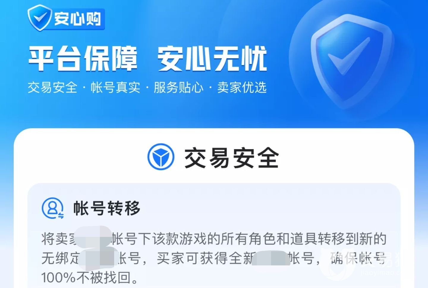 這種游戲賬號(hào)屬于虛擬財(cái)產(chǎn),而進(jìn)行交易的話,就必須涉及一個(gè)先付款還是先給密碼改綁的一個(gè)問題。交易貓平臺(tái)所做的事情就是為雙方提供很大的安全保障,整個(gè)的安全交易流程就更不用說,最主要的是有非常特色的安心購服務(wù)能夠支持用戶們換綁、平臺(tái)發(fā)貨和找回包賠。