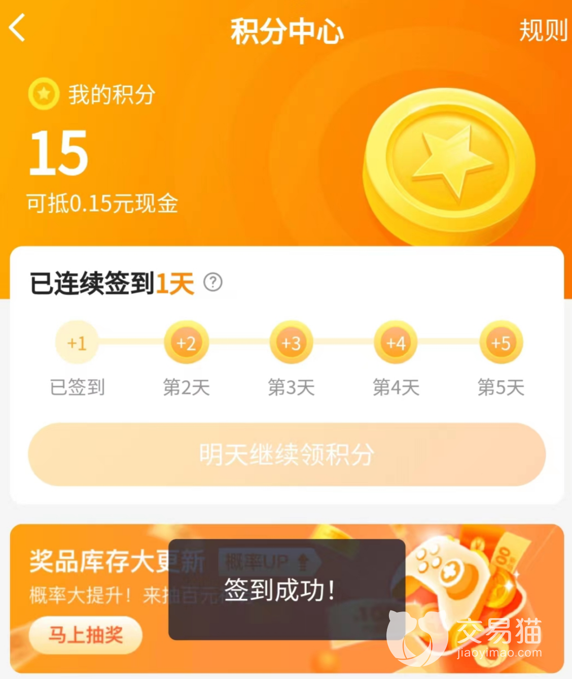 除了steam白號(hào)基礎(chǔ)價(jià)格低之外,交易貓還有個(gè)特色的積分簽到專區(qū),這里面每次簽到能領(lǐng)取到的金幣都是能在購買的時(shí)候抵現(xiàn)用的,要是感覺積攢太慢的話也能去用于抽獎(jiǎng),要是想獲取大量積分的話就去下單購買商品,它會(huì)根據(jù)你購買商品的實(shí)際價(jià)格百分比反還給你積分,所以你在交易貓中要是回購次數(shù)多的話價(jià)格是會(huì)變得更加優(yōu)惠。