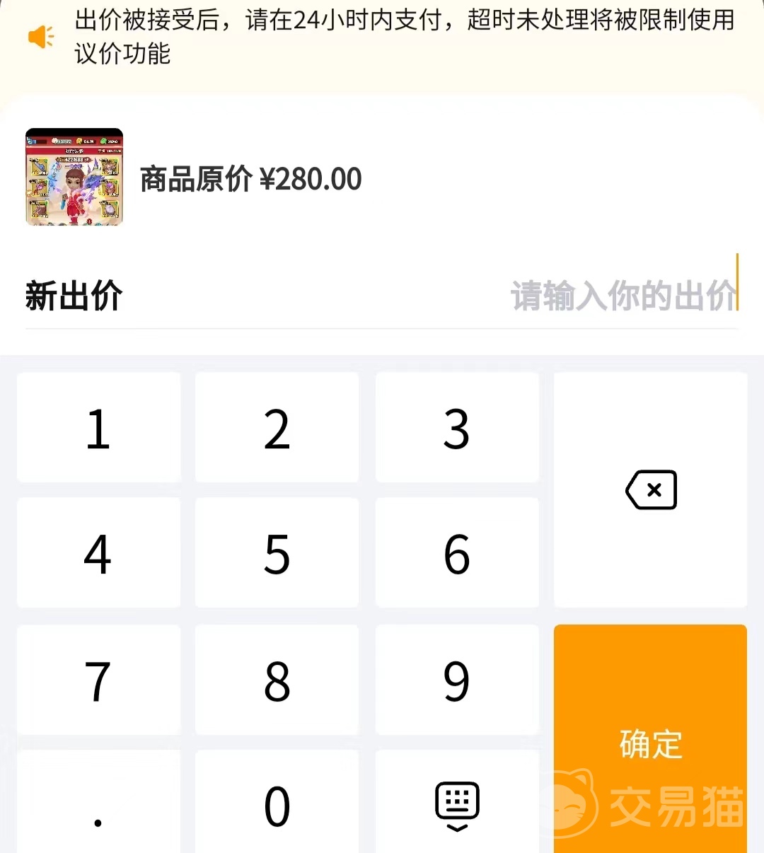 這款游戲在交易貓上成品號的價格本身就不高,大部分高級別賬號的價值都在300-600之間。交易貓上的游戲賬號價格的賣家制定的,并不是不能進行商議的。想要買賬號卻又覺得價格有點高,那就點擊賬號詳情頁上的【議價】功能,在這里玩家可以提出理想的價格,在議價時也會提醒玩家議價成功的話需要在24小時完成交易。
