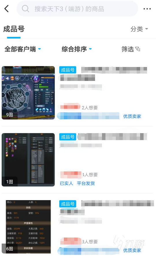 2、單獨(dú)的天下3交易專區(qū)當(dāng)中,會直接呈現(xiàn)出各種類型的成品號交易內(nèi)容,大家將任意挑選自己喜歡的游戲號來進(jìn)行查看。各位可以從價格以及賬號優(yōu)勢這兩點(diǎn)來進(jìn)行判斷整體的性價比。小編也推薦大家,將感興趣的商品進(jìn)行收藏,通過多輪對比之后在決定是否在線購買。