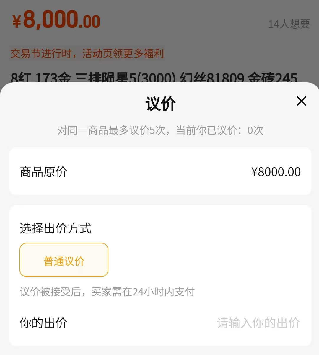 有些玩家覺得部分賬號很符合自己的需求,但是價格方面還是太貴了,覺得還是不支持購買那么啟動議價功能,利用這個功能跟出售方進行議價,如果議價成功的話,那么就可以較低的價格入手哦,而且雙方的交易都會有官方的保護,不會出現(xiàn)雙方權益丟失。