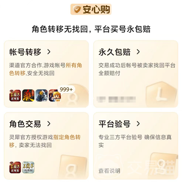 交易貓不僅僅只是對(duì)成品賬號(hào)有安全保障,只要是在這里購(gòu)買的賬號(hào),都是可以附加保險(xiǎn)的,而且交易貓里的“安心購(gòu)”款項(xiàng)當(dāng)中有一個(gè)賬號(hào)轉(zhuǎn)移的功能,因?yàn)橹皇遣糠仲~號(hào)攜帶這份功能,所以在購(gòu)買之前可以優(yōu)先選擇此類賬號(hào),因?yàn)橘~號(hào)轉(zhuǎn)移是出售游戲角色,而并非是出售賬號(hào),這種首創(chuàng)的模式基本是將找回的風(fēng)險(xiǎn)給完全杜絕掉了。