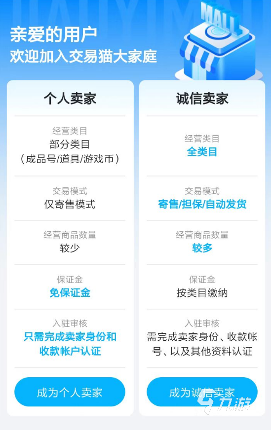 2、想要快速完成賬號的交易,大家需要事先在交易貓app當中申請成為一個合格的賣家。這里推薦個人玩家優(yōu)先選擇第一個賣家身份,不僅申請的流程十分簡單,各位也不用進行太過于復雜的身份驗證,一旦成功得到資格,大家就可以開始發(fā)布自己的商品。