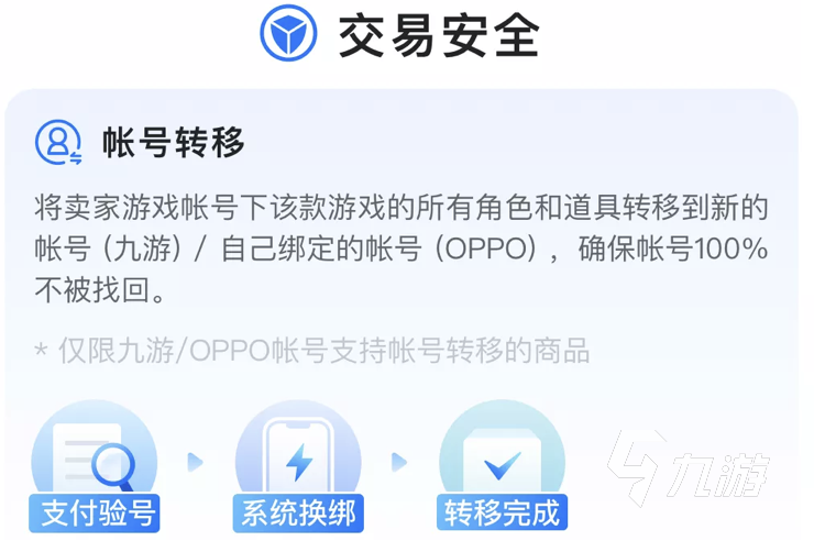 而且交易貓針對于九游帳號的話也有專屬福利,我們可以直接進行一鍵轉(zhuǎn)移,這個也是專門針對于九游賬號推出的專屬服務(wù),玩家可以使用一鍵轉(zhuǎn)移功能,將賬號內(nèi)的所有資源全部轉(zhuǎn)移到自己的九游帳號名下,這樣也能最大限度避免了交易之后賬號出現(xiàn)被找回的風(fēng)險。