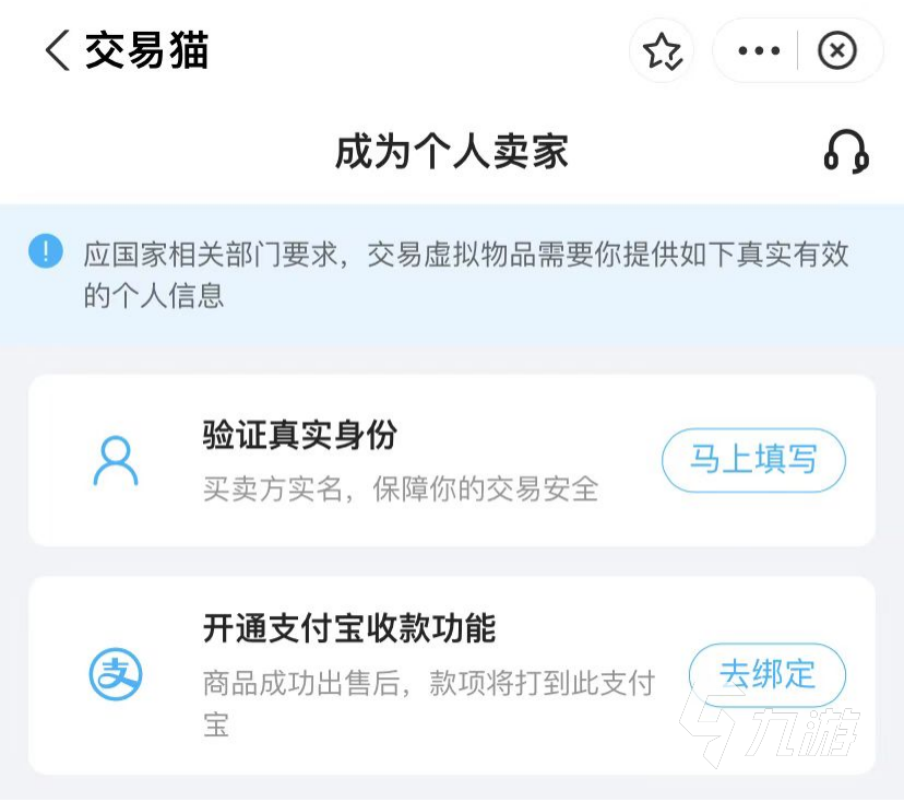 如果賬號游玩一段時間不想玩了,那么交易貓也可以讓你更輕松地出售賬號。通過驗證收款賬戶和賣家身份,就能夠享受到輕松愜意的賣號過程。開通實人認證,還能夠提高曝光度,讓賬號商品更快售出哦~