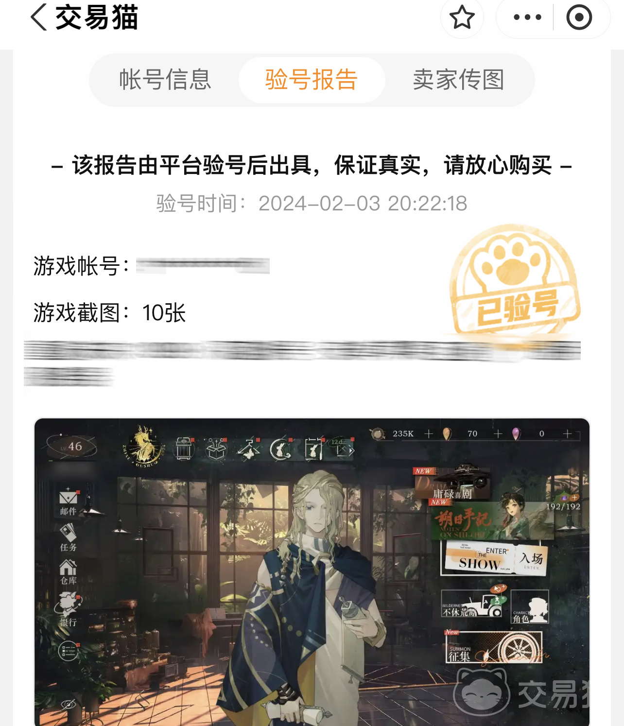 就算游戲商品有多么的誘人,但是如果不符合它所描述的信息的話,也會讓買家們的利益受損。這時候就可以選擇帶有平臺驗號報告的商品,便可仔細查看這一份驗號報告。里面上傳的信息及圖片都經過交易貓嚴格的核實。之后才上傳至平臺上,然后你可根據這份報告仔細查看里面的信息,例如有哪些角色以及人物是否為頂級。這樣就能更放心的入手,不用擔心出現紕漏。也能夠一目了然的看到該帳號是否像他所標的價格一般有價值,就不用擔心買貴了。