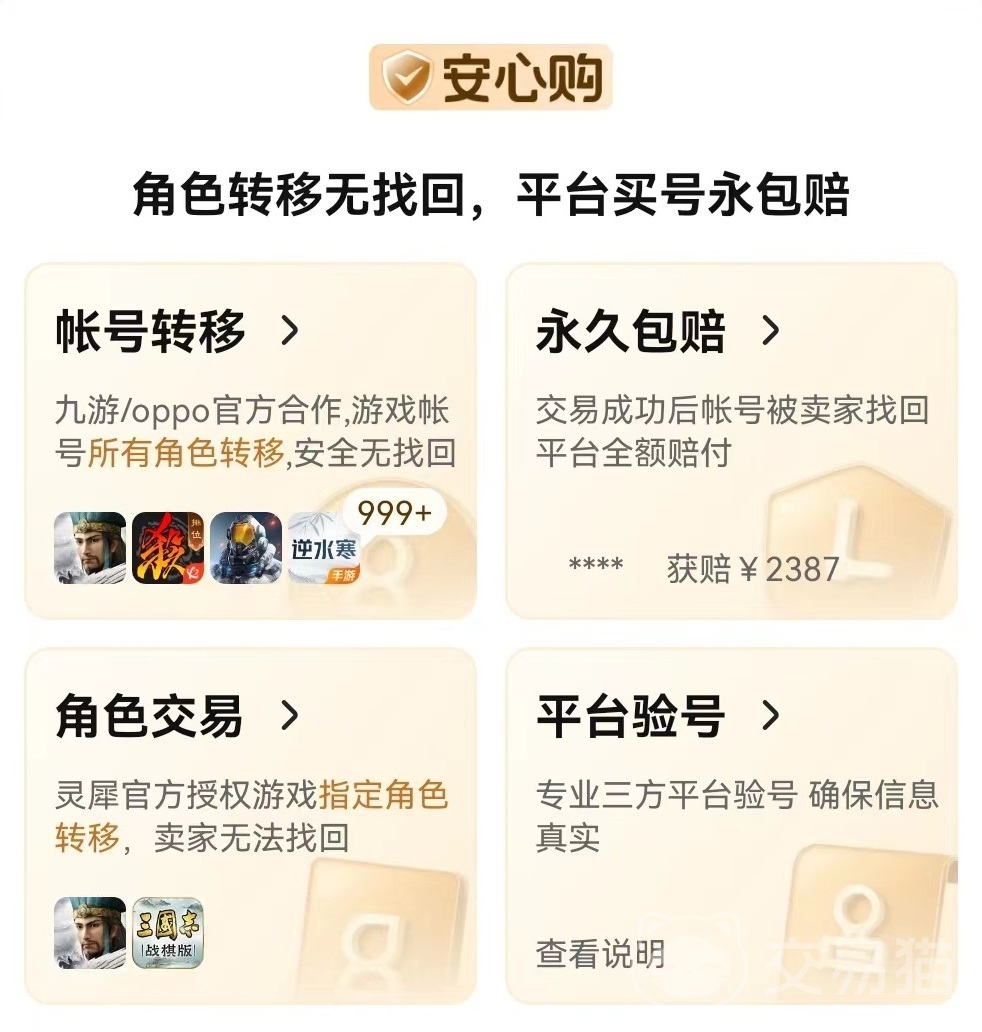 在交易過程中為了保證安全性,小編非常推薦大家去交易貓中進行交易,因為交易貓對于安全方面做得非常到位,已經(jīng)開發(fā)出了諸多保障措施??梢栽谌轿粸橛脩舻慕灰走^程保駕護航,非常適合想要購買一些價值比較高的游戲賬號的玩家。而且交易貓里面的人氣也非常高,商品數(shù)量眾多,這樣也給了買家挑選的機會。使用交易貓時候要注意,上面的鏈接目前只能用安卓用戶點擊去下載app,iOS用戶還只能去交易貓的官網(wǎng)才能進行操作。下面小編將詳細介紹一下,在保障賬號交易安全領(lǐng)域,交易貓所做的各種努力和設置出的各種保障措施,一起往下看吧。