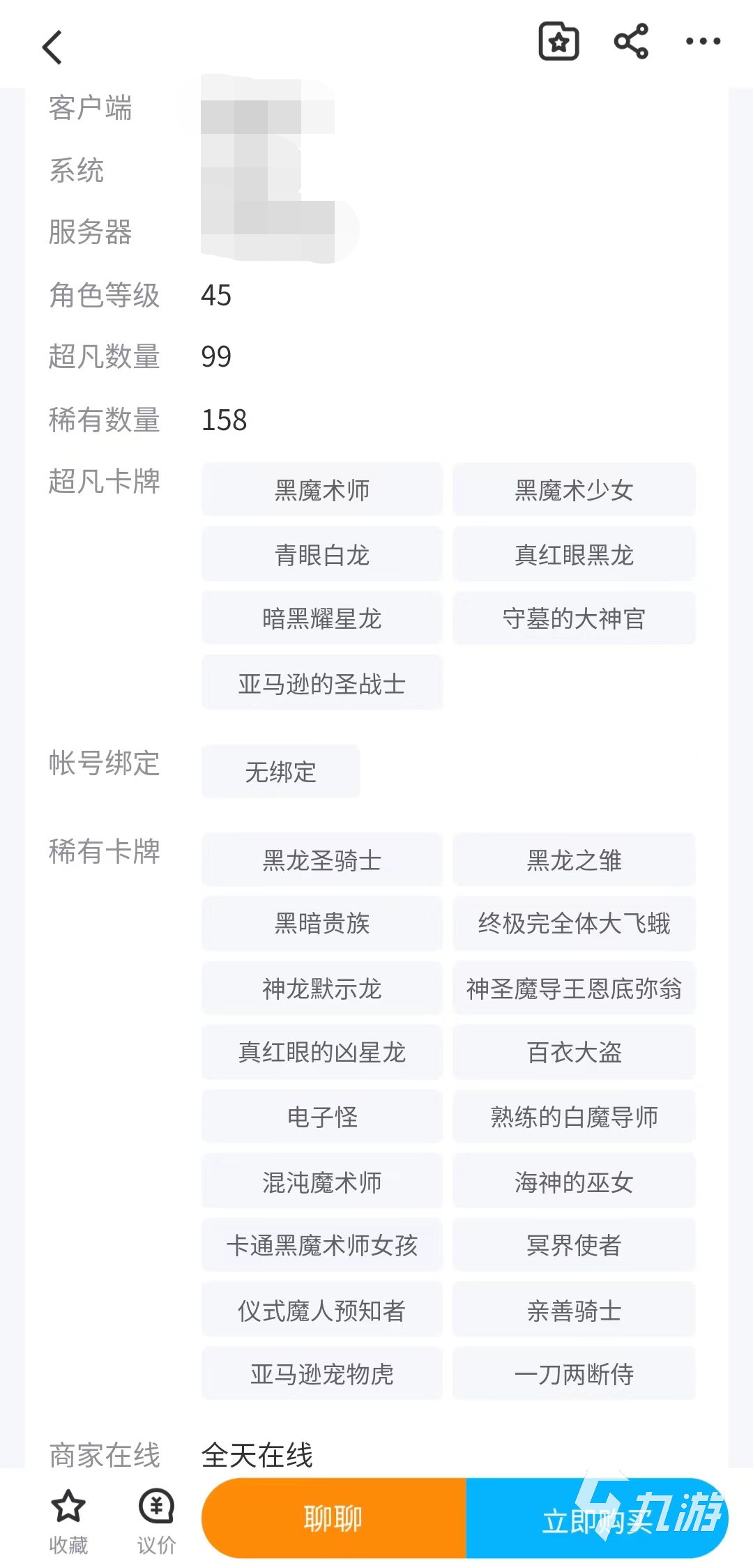 2、賬號內(nèi)容介紹詳細(xì)。每個商品下發(fā)都會有賬號內(nèi)高價值虛擬物品的標(biāo)注,凡是出現(xiàn)的一樣都不會少,所有的信息可謂是一目了然,能夠直接根據(jù)游戲客戶端、服務(wù)器、品質(zhì)來進(jìn)行定位,這樣也方便買家能快速定位到自己所需的產(chǎn)品,比如一些特別稀有的游戲王卡片,賣家在上架之前都會進(jìn)行特殊的標(biāo)注。
