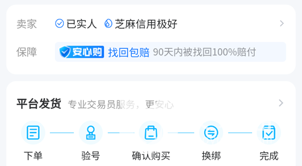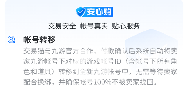 不想自己購(gòu)買的賬號(hào)被找回是買家們一致的訴求,交易貓為此也做出了十足的努力。比如說(shuō)跟九游合作傾力推出的賬號(hào)轉(zhuǎn)移服務(wù)在業(yè)界那也是相當(dāng)炸裂的。大家購(gòu)買戰(zhàn)雙帕彌什的時(shí)候認(rèn)準(zhǔn)帶有轉(zhuǎn)移標(biāo)簽的商品,在下單付款之后給客服一個(gè)自己注冊(cè)申請(qǐng)的賬號(hào),客服就會(huì)將商品賬號(hào)中的數(shù)據(jù)遷移到我們自己的賬號(hào)中,后續(xù)要玩也是登錄自己的號(hào),這樣基本就很難會(huì)出現(xiàn)被找回的情況了。
