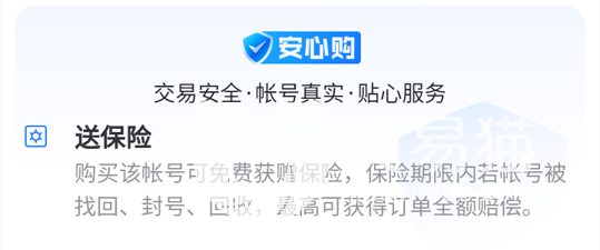 除了找回包賠之外,有一些商品帶有保險(xiǎn)贈(zèng)送,這種賬號(hào)也是比較推薦去購(gòu)買的。交易安全保險(xiǎn)相較于找回包賠來(lái)說(shuō)覆蓋的范圍更廣了,除了賬號(hào)被賣家惡意找回之外,如果買到的號(hào)因?yàn)榉馓?hào)呀、回收呀等情況沒(méi)有辦法繼續(xù)游玩,我們也是可以聯(lián)系官方去申請(qǐng)賠償?shù)?。不過(guò)和找回包賠相同,保險(xiǎn)本身也是有期限的,所以要求大家在發(fā)現(xiàn)問(wèn)題之后盡快解決喲。