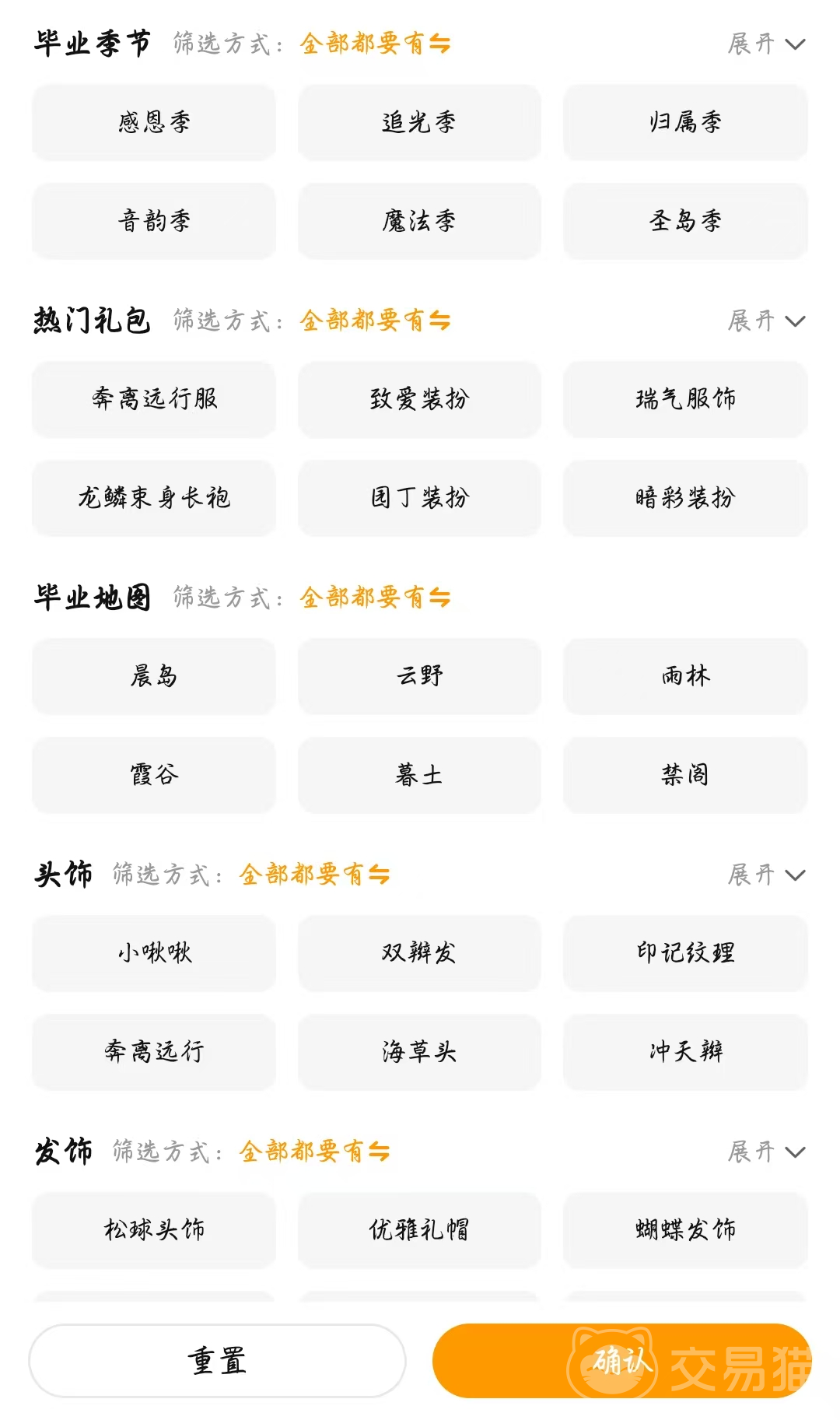 大家都知道在光遇里各種服裝是比較受歡迎的,在購買賬號的時候,除了要觀看當前的蠟燭資源以及等級之外,大家比較關注的就是服裝收集情況了,這一點在交易貓里就可以輕松的篩選,小伙伴們只需要在篩選欄目里勾選自己想要的時裝或者是禮包以及配飾就可以了,快速準確的定位當前大家想要的一些賬號。