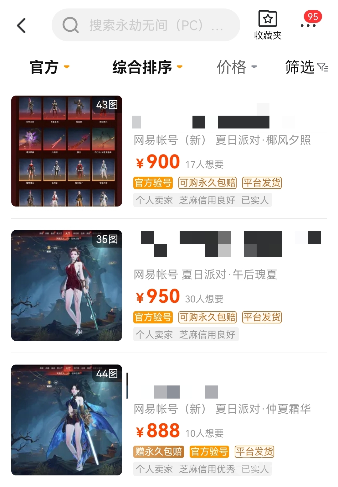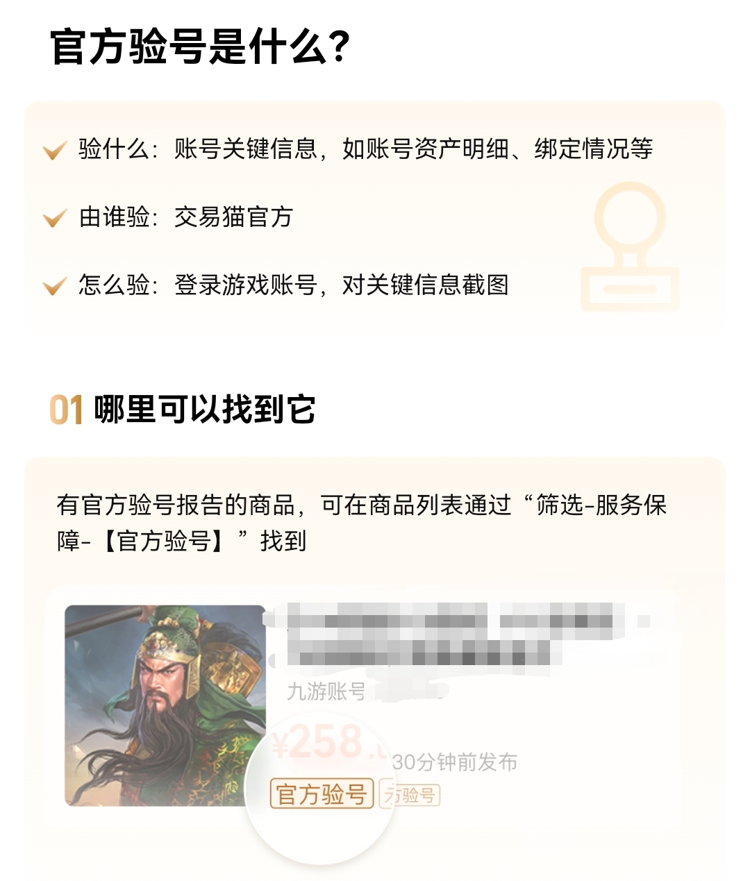 多數(shù)賬號(hào)已經(jīng)由官方預(yù)先驗(yàn)過(guò)賬號(hào)了(有“官方驗(yàn)號(hào)”標(biāo)識(shí)),驗(yàn)號(hào)截圖會(huì)在詳情頁(yè)中展示。小編建議大家買驗(yàn)過(guò)號(hào)的,以確保換綁給你的賬號(hào)就是賣家出售的這一個(gè)。部分商品還會(huì)贈(zèng)送服務(wù),比如永久包賠,賬號(hào)被找回,平臺(tái)全額退款,即使在交易完成后也有效。