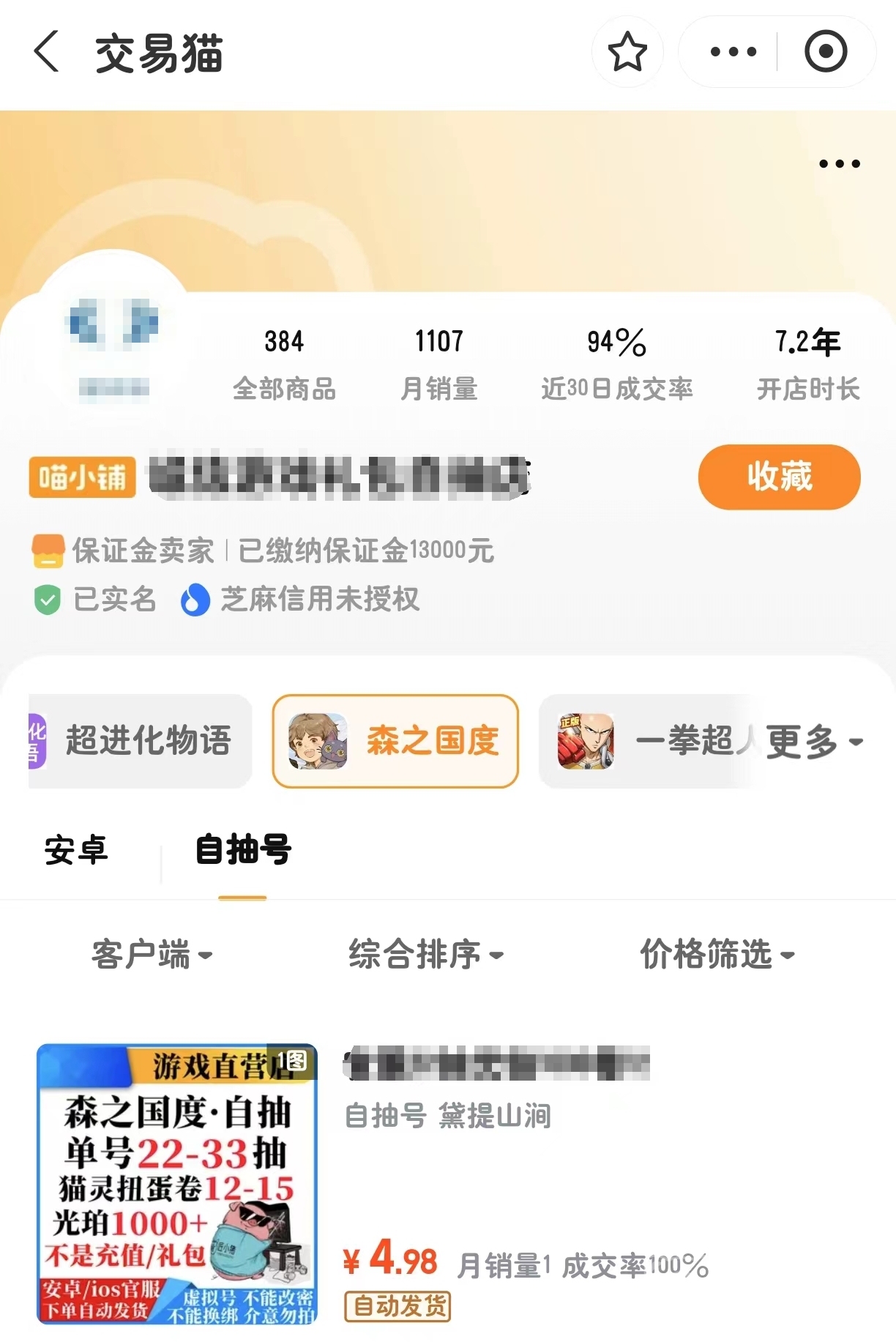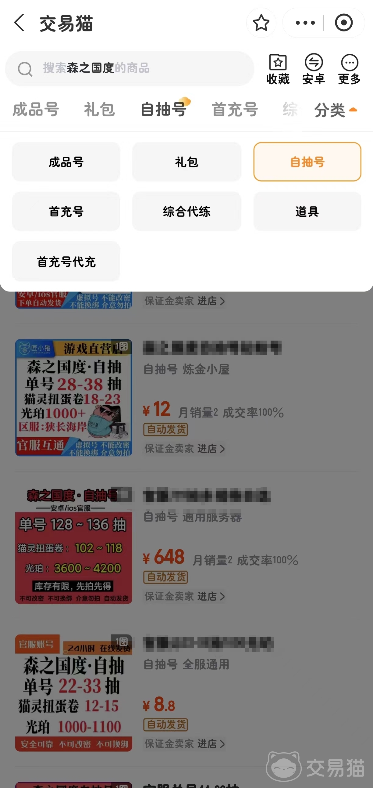 在交易貓上,玩家直接選擇購買森之國度的自抽號。這些自抽號經(jīng)過了平臺的嚴(yán)格審核,必須符合平臺的標(biāo)準(zhǔn)和要求,從而確保賬號的真實性和價值。自抽號內(nèi)包含了大量的游戲貨幣和道具,對于提升游戲體驗感有很大的益處,能夠讓玩家能夠以更低的價格快速提升自己的實力。