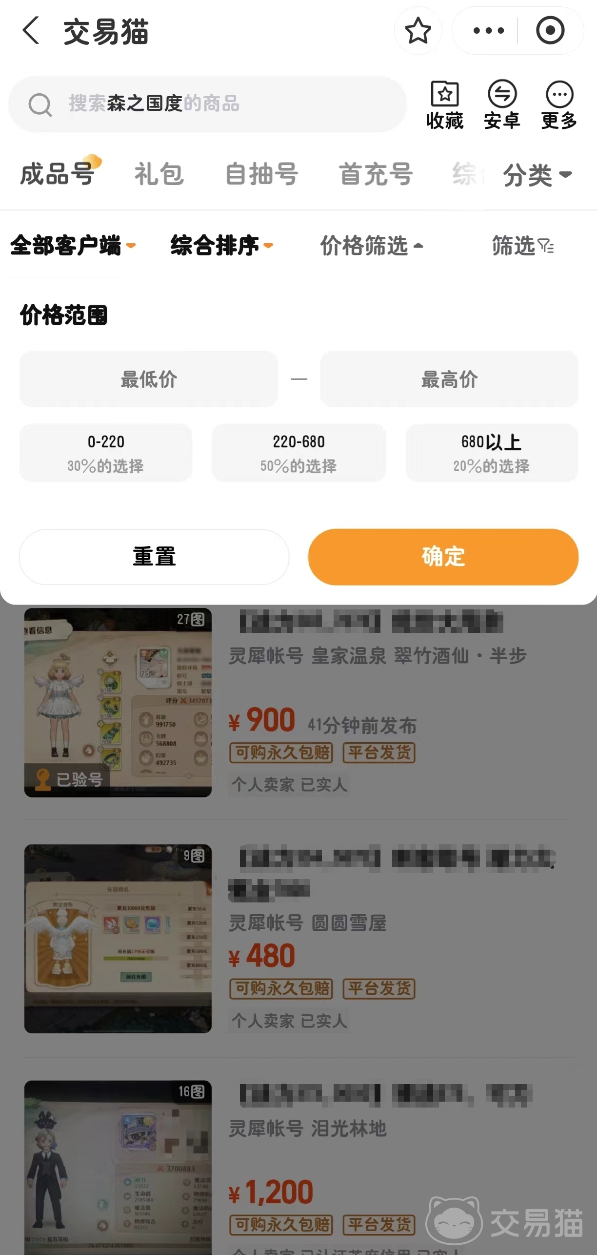 除了購買自抽號,交易貓還支持價格篩選功能,玩家可根據(jù)自己的預(yù)算來設(shè)定價格。這個功能為玩家提供了一個更加靈活的選擇方式,避免因為賬號的價格而挑花了眼,結(jié)合簡便直接的操作方式,讓玩家更高效地找到價優(yōu)質(zhì)廉的森之國度賬號,賬號實力足夠,玩家也能快速上手游戲。