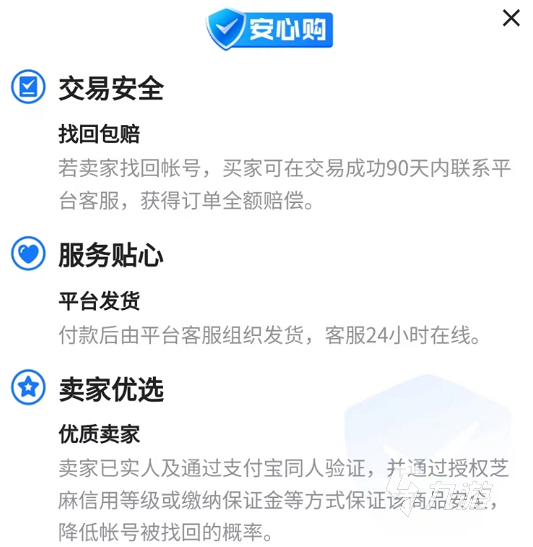 賣家在上架商品之前都需要進(jìn)行嚴(yán)格的實(shí)名認(rèn)證,以保證買家交易后的權(quán)益,平臺(tái)還特別貼心地推出了“安心購”服務(wù),用戶無需付錢也可免費(fèi)享受找回包賠的保險(xiǎn),在賬號(hào)交易的過程中還可以本人上號(hào)檢驗(yàn)。