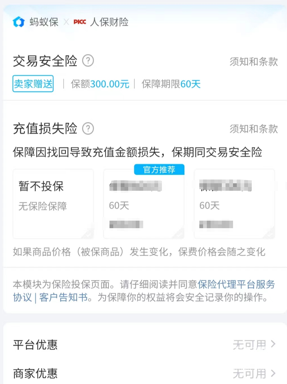 如果面對的是一些價值比較高的賬號,除了平臺基礎的安心購之外其實大家也能自己增添保險,交易貓所合作的保險公司都是特別有名的上市企業(yè),其中就有鮮為人知的人保財險,而要保障多長時間可由用戶來決定,其所需支付的價格其實遠遠不足賬號本身的價值,若是本來就有安心購再加上保險的話就相當靠譜了,花上幾十塊錢買保險本也微不足道。