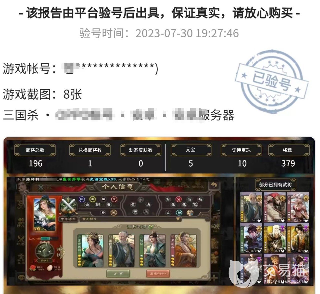游戲賬號雖然不是剛需,可平時要玩的時候大家難免會去投入一些時間和資金,時間久了花的錢也就自然數不清,很多角色的獲取方式不僅限于商城購買,更多地還要去選擇一些綁定禮包以及抽獎的模式,而你這些花的錢要是折合到后期賣號的話估計一半都難以回本,既然三國殺本身它就是要靠策略而不是靠裝備來取勝,那么就不如從一開始就去到交易貓選購賬號。