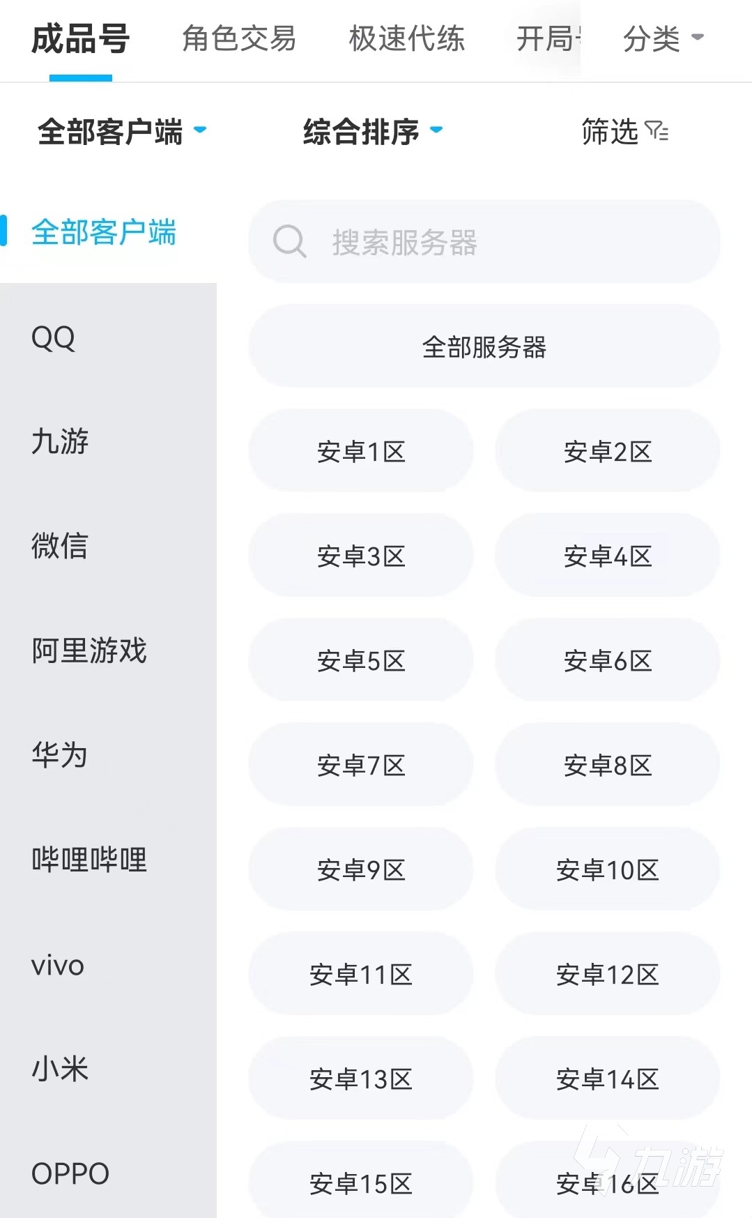 該平臺中購買賬號有充足的渠道服可以選擇,只要該游戲支持的平臺在這里都能夠找到,除了官方客戶端之外還有九游,豌豆莢,微信,QQ,華為,小米,OPPO vivo等多個渠道服務(wù)。只需要在對應(yīng)專區(qū)里在全部客戶端中就能查看到,這樣在購買的時候直接選中要買的渠道就可以篩選出來,非常方便。