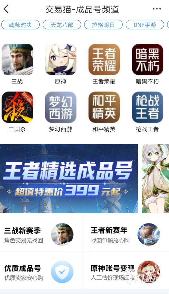 3、除了三國殺的專區(qū)當(dāng)中可以獲得大量成品號,目前交易貓也直接開放了針對性交易頻道。在成品號頻道內(nèi),各位將獲取到各大熱門游戲的賬號交易內(nèi)容。玩家只需要點擊喜歡的游戲進(jìn)行獲取即可。