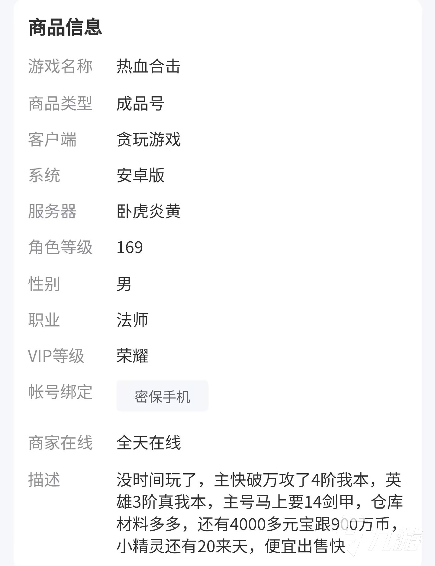 很多交易平臺(tái)在賣家出售商品填寫信息的時(shí)候,不會(huì)給予任何的幫助,只是給賣家一個(gè)文本框,讓大家描述一下自己的賬號(hào),但是交易貓的商品信息分類能夠讓賣家有目標(biāo)的去填寫相關(guān)數(shù)據(jù),這樣帶來(lái)的好處就是買家對(duì)比起來(lái)更方便,類似于所選職業(yè)為法師,道士還是戰(zhàn)士,VIP等級(jí)是榮耀還是普通黃金,密保手機(jī)了還是郵箱,不管是買家考不考慮得到的都會(huì)一一呈現(xiàn)在大家面前。