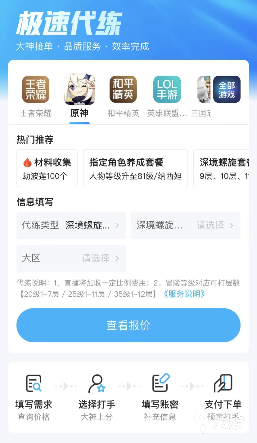 有了合適的原神角色賬號(hào)之后,玩家們也能選擇交易貓平臺(tái)上的代練功能,加快自己角色和裝備的培養(yǎng)進(jìn)度。讓你體驗(yàn)一會(huì)放置玩法,更快更輕松地獲得高練度雷神,省下更多時(shí)間探索提瓦特!
