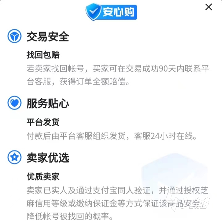 3、部分商品提供安心購服務(wù)。對于部分商品,如果賣家想把賬號找回,買方在三個(gè)月以內(nèi)可通過平臺客服獲得賠償。買方在付款結(jié)束后,由平臺客服安排發(fā)貨,保障雙方交易安全。同時(shí),平臺通過支付寶、芝麻信用等方式,為你篩選優(yōu)質(zhì)的賣家,降低賬號找回幾率。