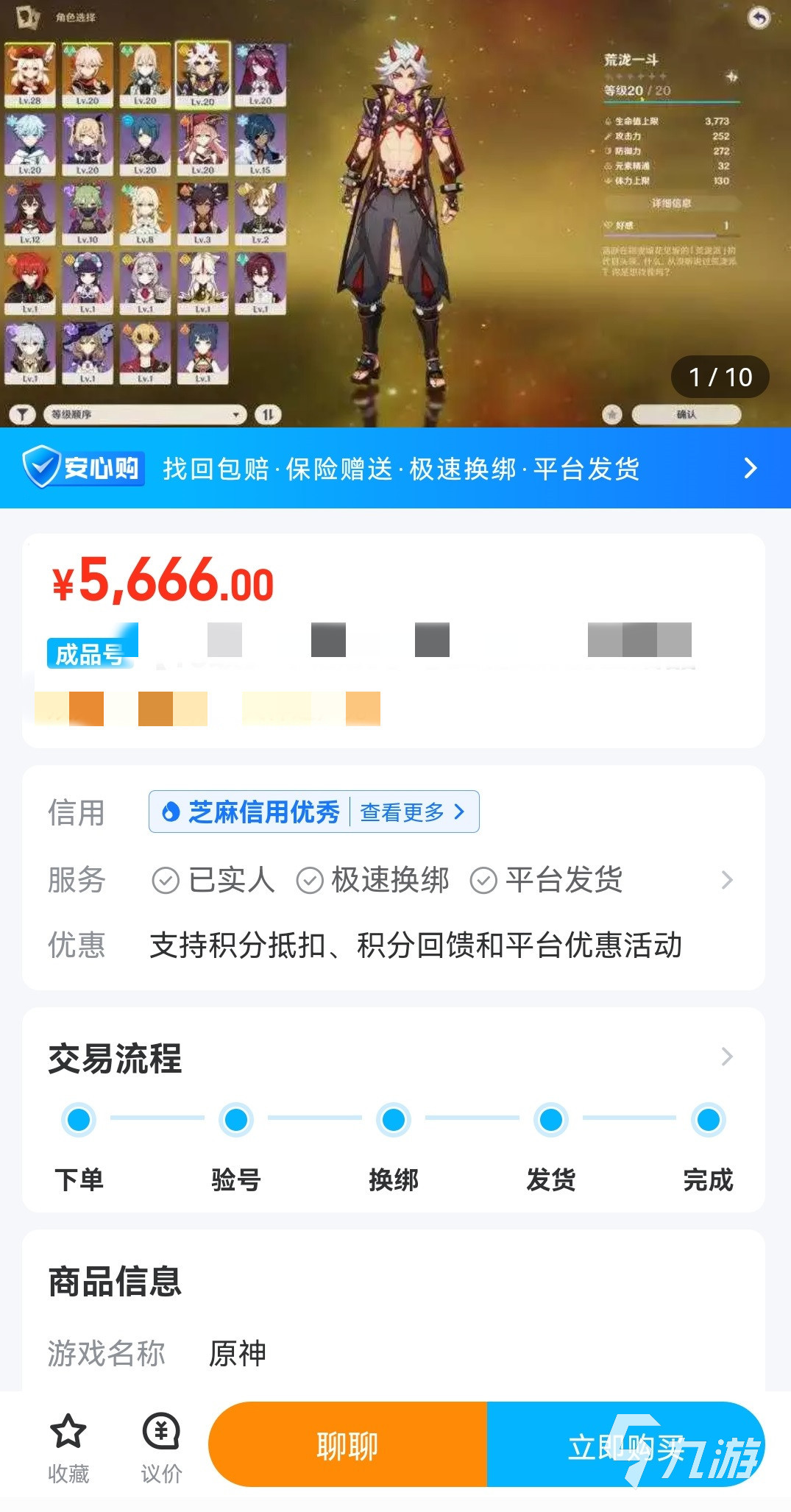 更進(jìn)一步的就是點開經(jīng)過層層篩選的賬號,查看更加詳細(xì)的內(nèi)容,包括賬號中是否有自己需要的五星角色和5星武器,以及當(dāng)前的冒險等級等內(nèi)容。同時在賬號下方還會有商家的簡單描述。一切都確認(rèn)好之后,直接點擊購買就會由平臺進(jìn)行自動發(fā)貨,密碼和密保等問題都由平臺妥善解決。
