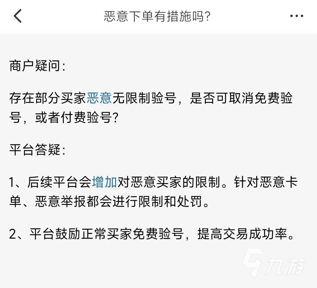 交易貓為了確保賣家也可以在平臺(tái)內(nèi)擁有良好的交易體驗(yàn),也有相關(guān)的保護(hù)措施,就比如如果賣家發(fā)現(xiàn)買家有惡意驗(yàn)號(hào),惡意下單的情況可以直接向平臺(tái)反饋,交易貓也會(huì)有相關(guān)處理。