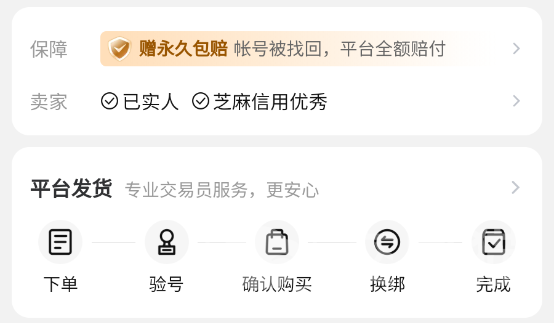 平臺(tái)為了保證交易安全為我們提供了一系列的防護(hù)手段,其中比較值得注意的就是有部分賬號(hào)支持的贈(zèng)送永久包賠服務(wù)以及對(duì)于賣家信息的展示。軟件通過(guò)和支付寶芝麻信用體系綁定一起可以直觀看到賣家的信譽(yù)情況,這也是我們挑選賬號(hào)的重要考量。而永久包賠則可以防止出現(xiàn)賬號(hào)被找回或者是內(nèi)容丟失的情況,就算是出現(xiàn)了也能夠通過(guò)申訴去申請(qǐng)索賠、挽回?fù)p失。另外,軟件中的絕大多數(shù)商品都支持平臺(tái)發(fā)貨模式,在下單付款之后可以秒收到賬號(hào),并且有專業(yè)客服協(xié)助我們完成換綁,操作十分方便。