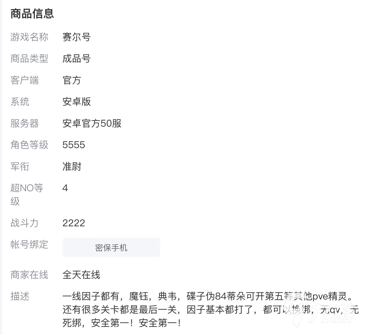 玩家在挑選賽爾號(hào)的途中,正常來說需要消耗大家大量的時(shí)間來比較,但是在交易貓中就能幫玩家節(jié)省時(shí)間成本。玩家找到感興趣的賬號(hào)鏈接后,進(jìn)入詳情頁中,可以一眼看到清楚展示的賬號(hào)信息像客戶端、等級(jí)、軍銜、戰(zhàn)斗力等等,迅速匹配到滿意的賬號(hào);玩家若有明確的目標(biāo),也可以通過游戲?qū)^(qū)的搜索裝輸入關(guān)鍵詞篩選,使交易更加高效。