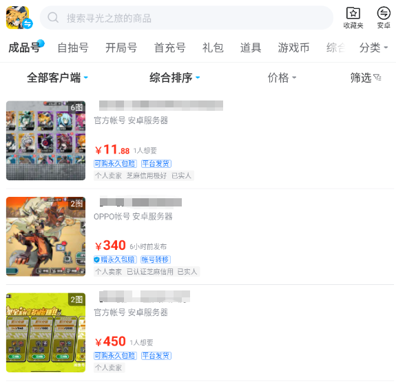 1、可出售賬號(hào)類型多,平臺(tái)買賣交易活躍。在首頁(yè)搜索點(diǎn)擊進(jìn)入尋光之旅游戲?qū)^(qū),可以看到支持成品號(hào)、首充號(hào)、禮包道具、游戲幣等分類。如果你不知道自己賬號(hào)值多少錢,也可以通過篩選功能估值,挑選對(duì)比與自己賬號(hào)相似的商品,清楚了解賬號(hào)的市場(chǎng)價(jià)。