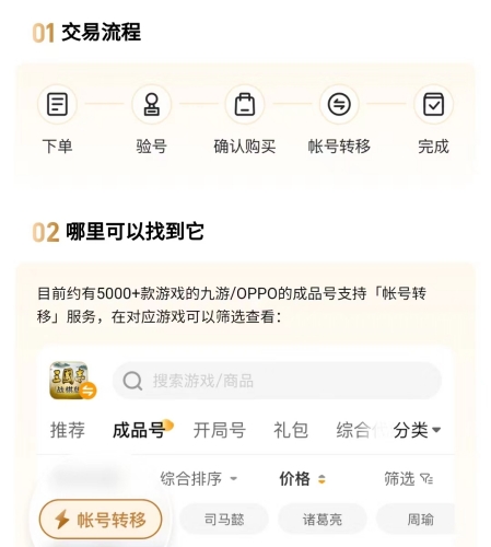 2、部分賬號(hào)支持角色轉(zhuǎn)移。尋光之旅手游里的OPPO、九游賬號(hào),帶有賬號(hào)轉(zhuǎn)移標(biāo)識(shí)的商品,能夠使用交易貓平臺(tái)提供的賬號(hào)轉(zhuǎn)移功能,一鍵將想銷售的游戲賬號(hào)里游戲角色與道具轉(zhuǎn)移到買家指定的賬號(hào)中,讓系統(tǒng)自動(dòng)完成轉(zhuǎn)移的事務(wù),賣家省時(shí)又省勁,很適合平時(shí)需要上班上學(xué)的用戶。