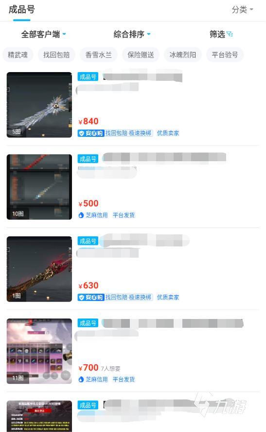 當(dāng)然,單紅或單金要稍微難出一些,不過價(jià)格別定太高還是有機(jī)會的,但相信各位想賣號的兄弟應(yīng)該已經(jīng)玩了很久,賬號或多或少也積攢了多個(gè)紅皮和金皮,那么這種號的價(jià)值就非常可觀了,大家可以看看上面放出的這個(gè)商品列表,這些號普遍都在五紅上下,而它們的價(jià)值也都在五百到一千。