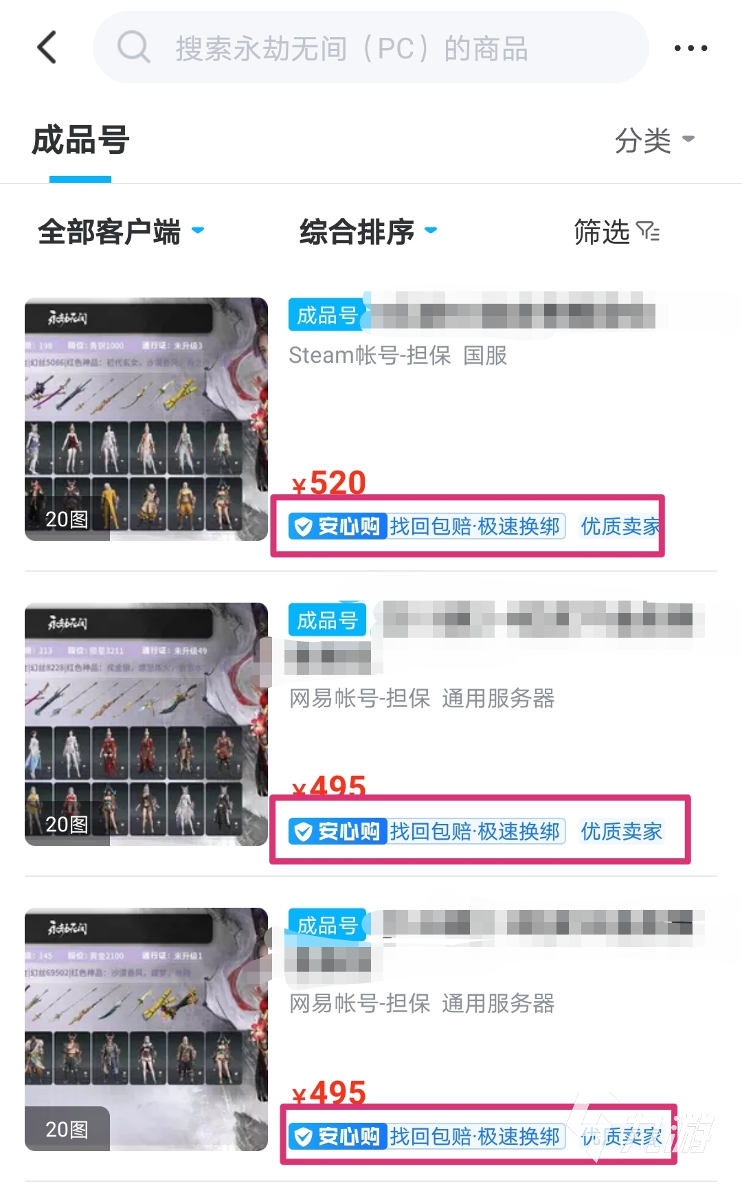 小編推薦各位在交易貓平臺(tái)上買號(hào)的其中一個(gè)原因是:安全性。首先,不可否認(rèn)每一個(gè)交易平臺(tái)上的賣家都會(huì)存在質(zhì)量良莠不齊的情況,不過(guò)交易貓不乏優(yōu)質(zhì)賣家入駐,這些人賣的商品往往保障服務(wù)多,許多商品都有找回包賠、保險(xiǎn)贈(zèng)送、極速換綁之類的標(biāo)識(shí),這樣更便于買家分辨哪一款商品買來(lái)更可靠。