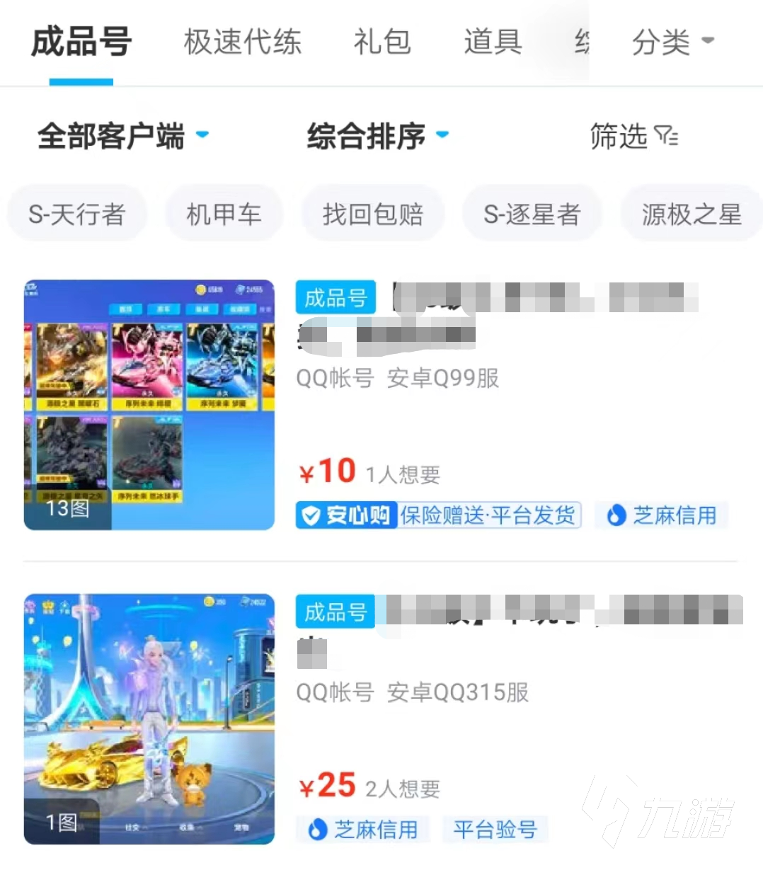 進(jìn)入交易貓以后,可以直接搜索qq飛車就能看到交易專區(qū)了,除了成品賬號外還有禮包、道具、首充號、代練等多種商品跟服務(wù),只要選擇對應(yīng)的分類就能查看商品。平臺還增加了價格區(qū)間、服務(wù)保障等多種智能引擎,勾選以后可以快速找到符合要求的賬號,這樣搜索起來特別方便,不像大海撈針那樣挑選賬號。