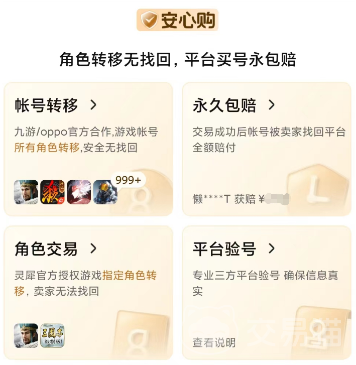 因為首充號它的檔位選擇多,有時也要花費上千元去購買高比例的賬號,所以說賬號的安全性還是得有更好地保障,對此交易貓選擇的是對部分信譽良好商家贈送安心購的特權,這份特權恰好面向買家可提供找回包賠的一個服務,并且購買時只要認準帶有相關包賠服務標志的賬號,就能在規(guī)范的范圍之內享受包賠的服務。