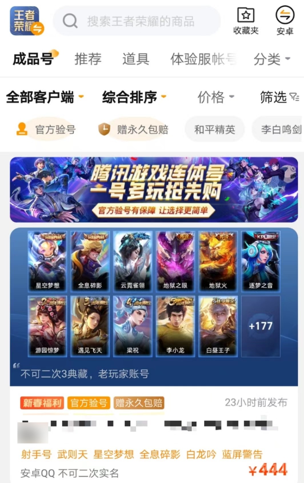 在交易貓上搜索這款游戲的賬號發(fā)現(xiàn)這款游戲的賬號價格在500-1500之間會有多種的選擇。這是因為如果賣家在這款游戲中氪金越多賬號等級越高,價值也就越高。玩家可以根據(jù)自己的實力進行選擇。在游戲設(shè)定中你的級別越高,能夠匹配到的隊友或者是對手級別也會越高。操作不夠靈活的建議選擇低等級的賬號,這些賬號的價格也不會太高?,F(xiàn)在正處于交易貓的新春活動期間,購買賬號獲贈【永久包賠】服務(wù),這樣能夠更好的保障買家的權(quán)益。