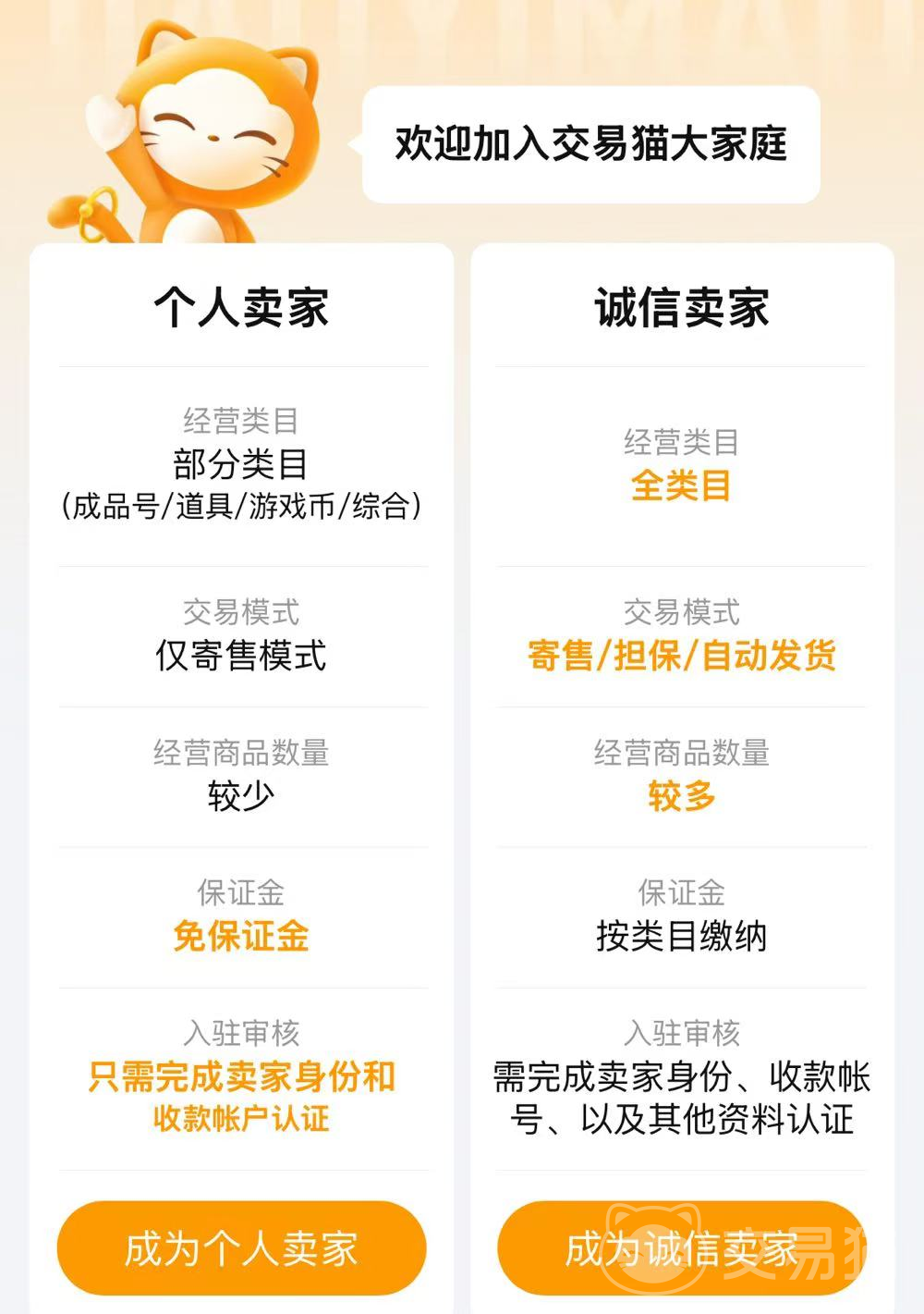 不管是QQ飛車端游還是手游的賬號(hào)都能在交易貓上出售,注冊(cè)個(gè)人賣家非常簡(jiǎn)單,認(rèn)證身份證跟收款賬戶立馬就能開(kāi)通賣家權(quán)限。如果出售的商品多,并且想獲得更多的流量扶持也可以注冊(cè)誠(chéng)信賣家,不過(guò)誠(chéng)信賣家需要繳納一定的保證金,大家按需選擇。