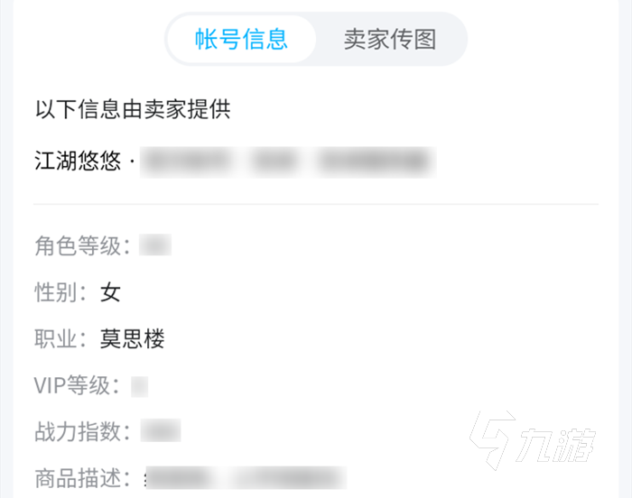 在賣家上架賬號商品的過程中平臺會要求其填入賬號的一些基本信息和參數(shù),并且力求通過詳細(xì)的表述來增加賬號商品的曝光度。大家在挑選的時候點(diǎn)擊詳情頁面就能夠看到這些描述。針對江湖悠悠這款作品,商品都公布了其角色等級、性別、職業(yè)、戰(zhàn)力指數(shù),以及賬號本身的額外VIP等級等。