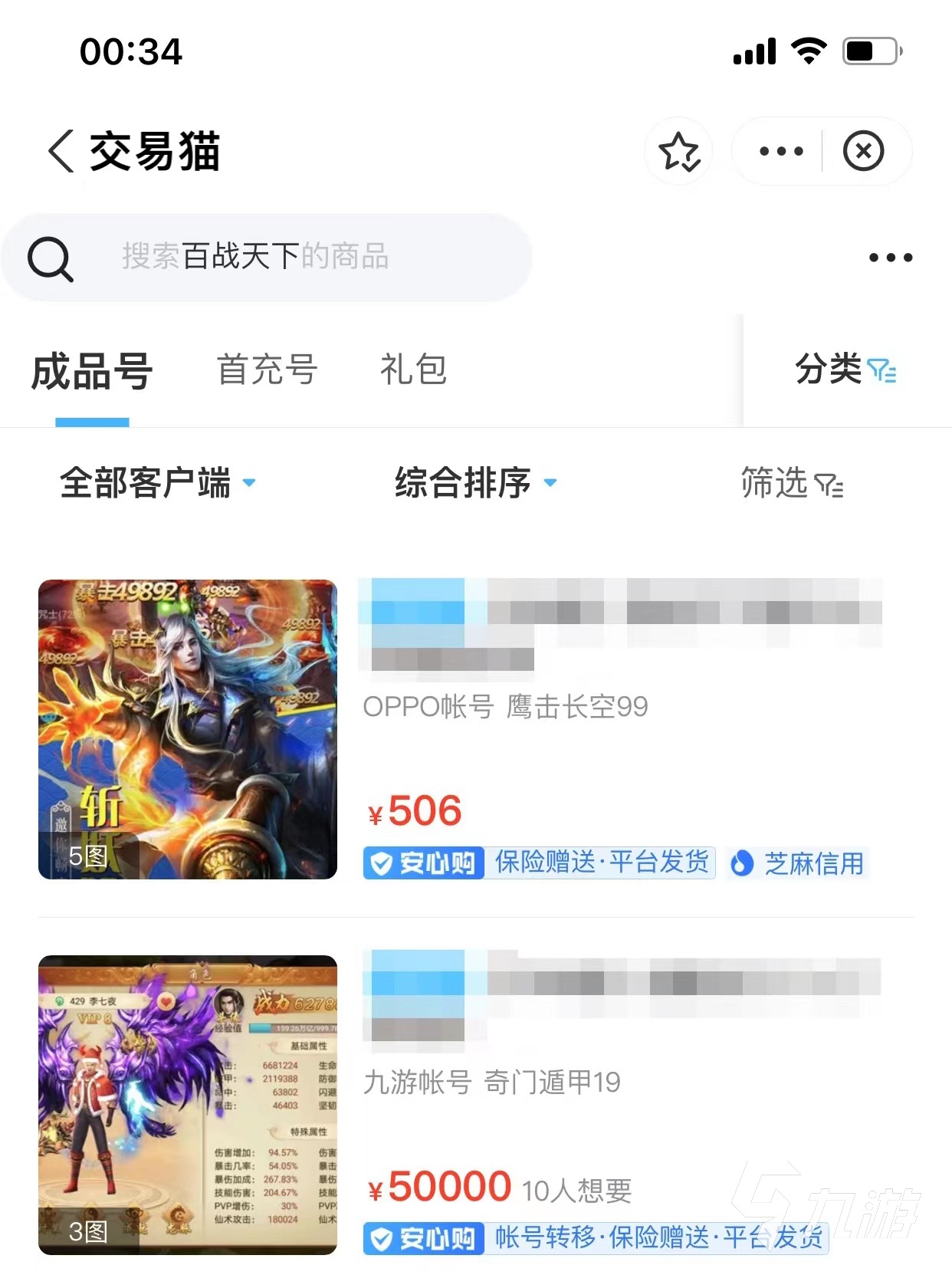 在游戲中玩家們可以挑戰(zhàn)各類(lèi)boss來(lái)升級(jí),還可以通過(guò)掛機(jī)刷野來(lái)獲取更多經(jīng)驗(yàn),到達(dá)40級(jí)后還能選擇鯤作為坐騎,非常的酷炫。小伙伴們可能覺(jué)得升級(jí)比較麻煩,這時(shí)候就可以看看成品帳號(hào)了。在交易貓中搜索百戰(zhàn)天下,就能看到多種賬號(hào)可以選擇。選擇交易貓有什么好處呢: