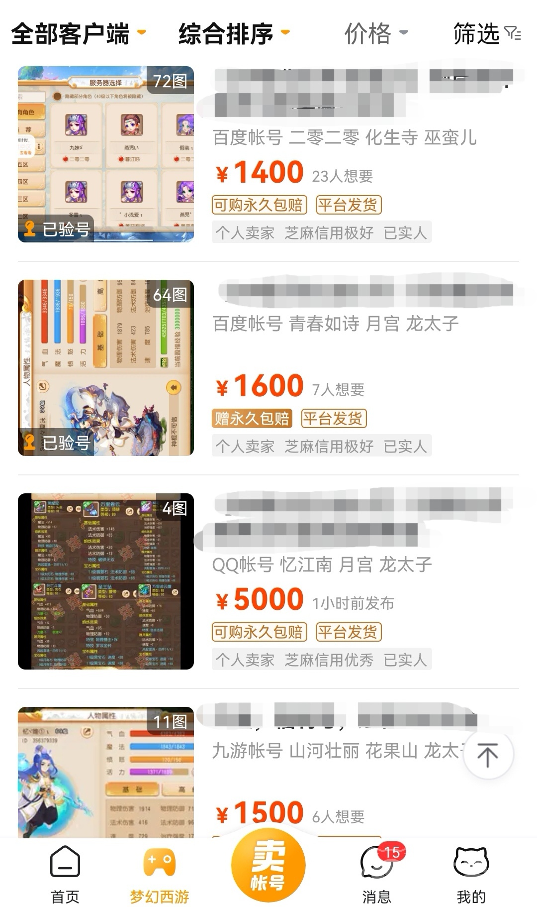 想要知道自己的賬號(hào)值多少錢(qián)你就要找到對(duì)應(yīng)的游戲?qū)^(qū)看看其他賣(mài)家給出的價(jià)格,畢竟每個(gè)賬號(hào)當(dāng)中的資源和等級(jí)都有所差異,所以大家還是要根據(jù)實(shí)際情況進(jìn)行對(duì)比和分析,這樣你得到的價(jià)格才會(huì)更加合理。得到價(jià)格之后就可以直接找到夢(mèng)幻西游游戲?qū)^(qū)將你的賬號(hào)出售了,把你有的深??聃徍推渌膶櫸锘蛘哔Y源等內(nèi)容呈現(xiàn)在詳細(xì)信息當(dāng)中,感興趣的買(mǎi)家就會(huì)去咨詢和購(gòu)買(mǎi),有的小伙伴還不會(huì)把自己賬號(hào)的特點(diǎn)和優(yōu)勢(shì)展現(xiàn)出來(lái),交易貓?jiān)谶@一方面也為大家考慮到位了,平臺(tái)一問(wèn)一答的形式幫助大家更好的介紹賬號(hào)信息,提供的模板也能夠讓大家全方面的介紹賬號(hào),不遺漏哪一點(diǎn)哪一方面。