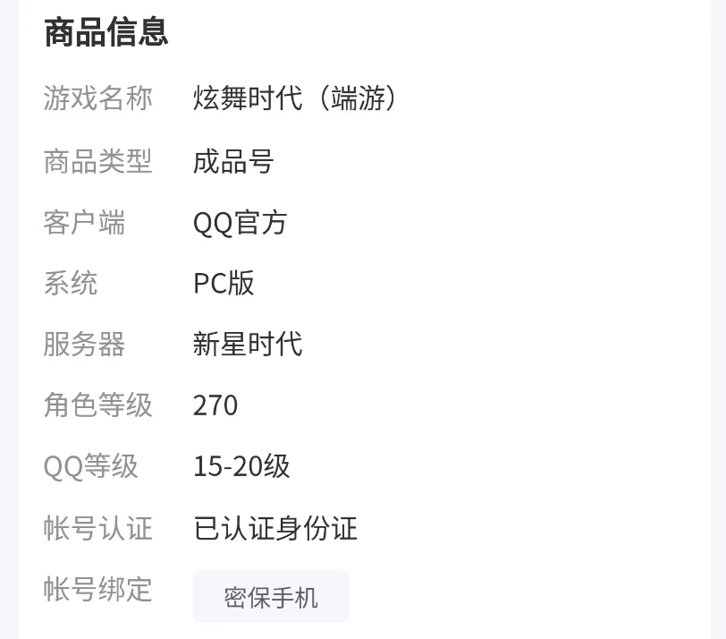 炫舞時(shí)代由于是使用QQ登錄,這些老玩家一般也玩過其他游戲,他們都是可以在商品信息描述中寫出來的,比如游戲的角色等級(jí),QQ等級(jí)以及賬號(hào)認(rèn)證和綁定情況,都是能夠讓買家一眼就能了解到該賬號(hào)的重要價(jià)值所在從而做出是否將要購買的判斷,這其實(shí)也是平臺(tái)幫助賣家對(duì)賬號(hào)信息有一個(gè)準(zhǔn)確的方向性引導(dǎo)填寫的功勞。