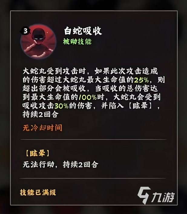 被動技能白蛇吸收,在大蛇丸受到攻擊時,如果此次攻擊打出的傷害超過大蛇丸最大血量的25%,那么超出的部分會被吸收。當吸收的總傷害達到100%時,大蛇丸會受到30%已經(jīng)吸收的傷害,并陷入眩暈中。這個效果其實就是變相提升了大蛇丸的生存能力,對方即使輸出再高,想要短時間內(nèi)秒掉大蛇丸也是很難的。最后一個被動是在戰(zhàn)斗開始時提升20%防御,30%生命上限和15%抗爆,進一步提升了大蛇丸的生存能力。正是因為大蛇丸這樣的出色技能效果,才使得現(xiàn)在很多頂級陣容中也都會將大蛇丸加入進去,現(xiàn)在最強勢的一套陣容當屬大蛇丸、宇智波佐助、角都、雷影、我愛羅和綱手,這是目前的t0搭配。
