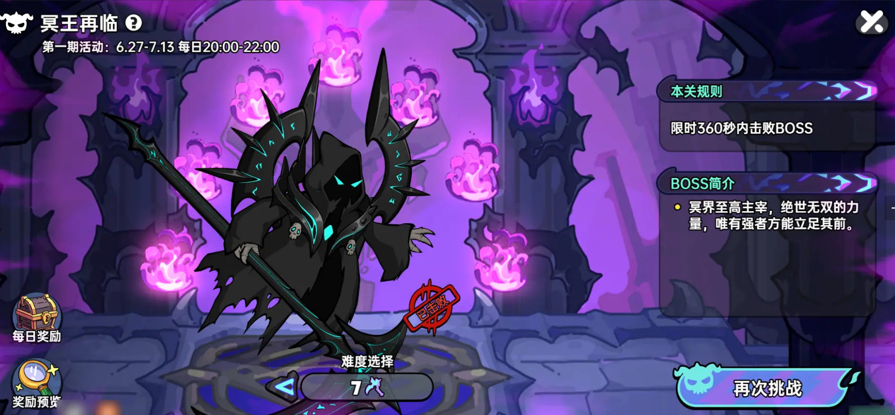 冥王再臨簡(jiǎn)單來(lái)說(shuō)就是個(gè)挑戰(zhàn)boss的玩法,總共會(huì)有7種不同的難度選擇,每提升一個(gè)難度,我們要面對(duì)的boss就會(huì)大幅度被加強(qiáng),每一次成功挑戰(zhàn)不同難度的冥王,就能獲得對(duì)應(yīng)的首通和每日獎(jiǎng)勵(lì)。