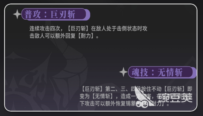 錫蒙利雖然不是SSR級(jí)人氣角色,卻藏著輸出、續(xù)航、輔助三重驚喜。她的技能鏈圍繞耐力管理而展開,普攻”巨刃斬“四連斬基礎(chǔ)扎實(shí),擊倒敵人時(shí)還能回耐力,長(zhǎng)按二三四段更可進(jìn)化為魂技”無情斬“,傷害翻倍且追加魔力回復(fù)。