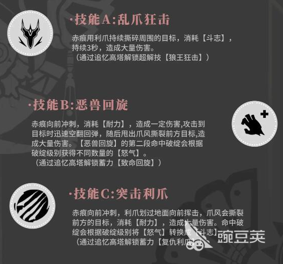 解鎖追憶高塔時,他的技能還可以進(jìn)一步的提升。亂爪狂擊就會直接變成狼王狂擊,消耗斗志還會持續(xù)三秒,然后去撕裂周圍的敵人,范圍傷害就可以直接拉滿。惡獸回旋會多一個致命回旋,突擊利爪還可以解鎖復(fù)仇利爪,每一次升級都可以讓輸出更上一層樓。還有一個大招遠(yuǎn)古怒魂,這就是團(tuán)隊的力氣,在蘇醒之后一聲猿叫就可以讓所有的隊友提升攻擊的欲望,而且還可以增加攻擊力系數(shù)。不管是打boss還是打副本,整個隊伍的輸出都會迎來一次小爆發(fā)。