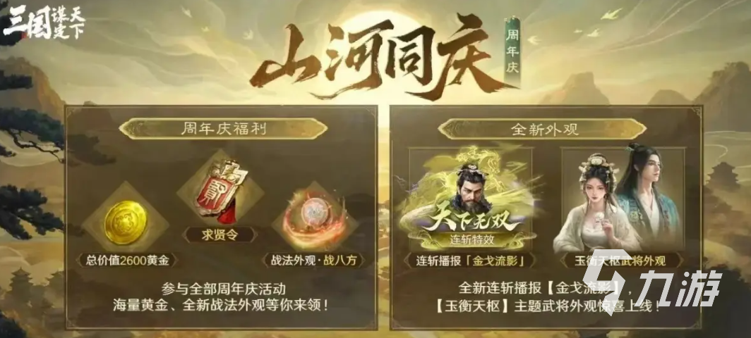 先說(shuō)這次版本更新時(shí)間,6月11日也就是周三凌晨2點(diǎn)到6點(diǎn)維護(hù),維護(hù)后將開(kāi)啟“山河同慶”周年慶主題活動(dòng)。整個(gè)主題活動(dòng)期間可以獲得獎(jiǎng)勵(lì)包含共計(jì)約2600黃金,求賢令抽卡道具,戰(zhàn)法外觀“戰(zhàn)八方” 。